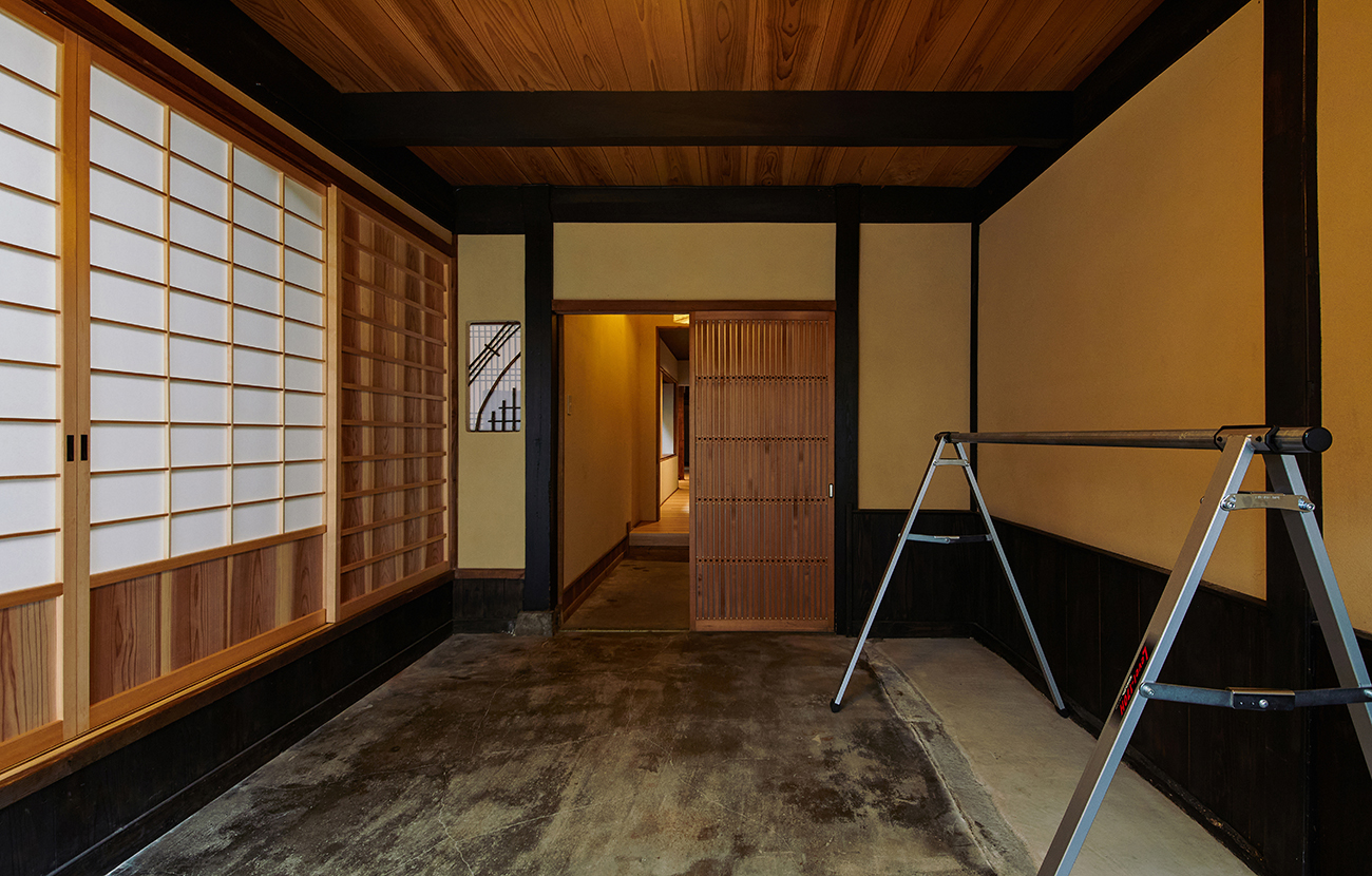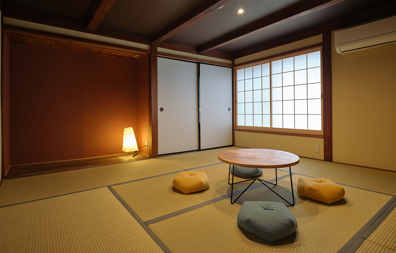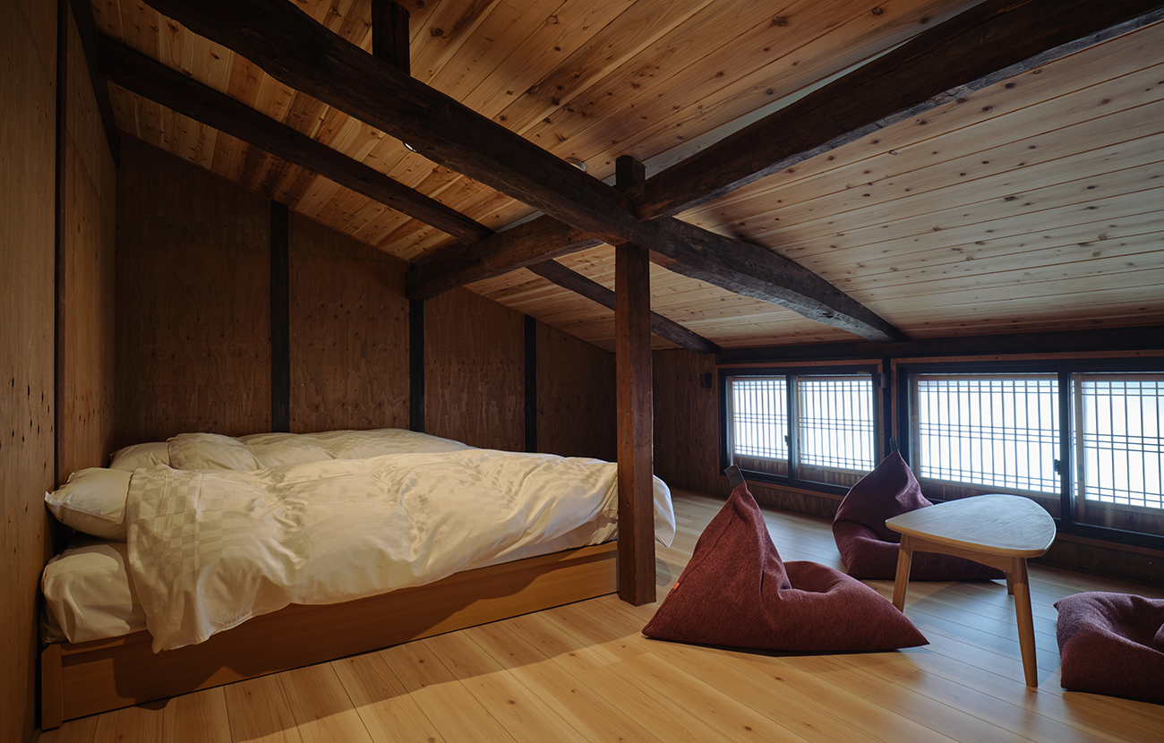 Located in the Nishizu area, which once prospered as a port of call for Kitamae ships, “Kasamatsu” is a former sake brewery that is over 100 years old. The bedrooms on the second floor have a modern atmosphere with magnificent beams adorning the ceiling. The entrance has a large earthen floor and a bicycle stand.