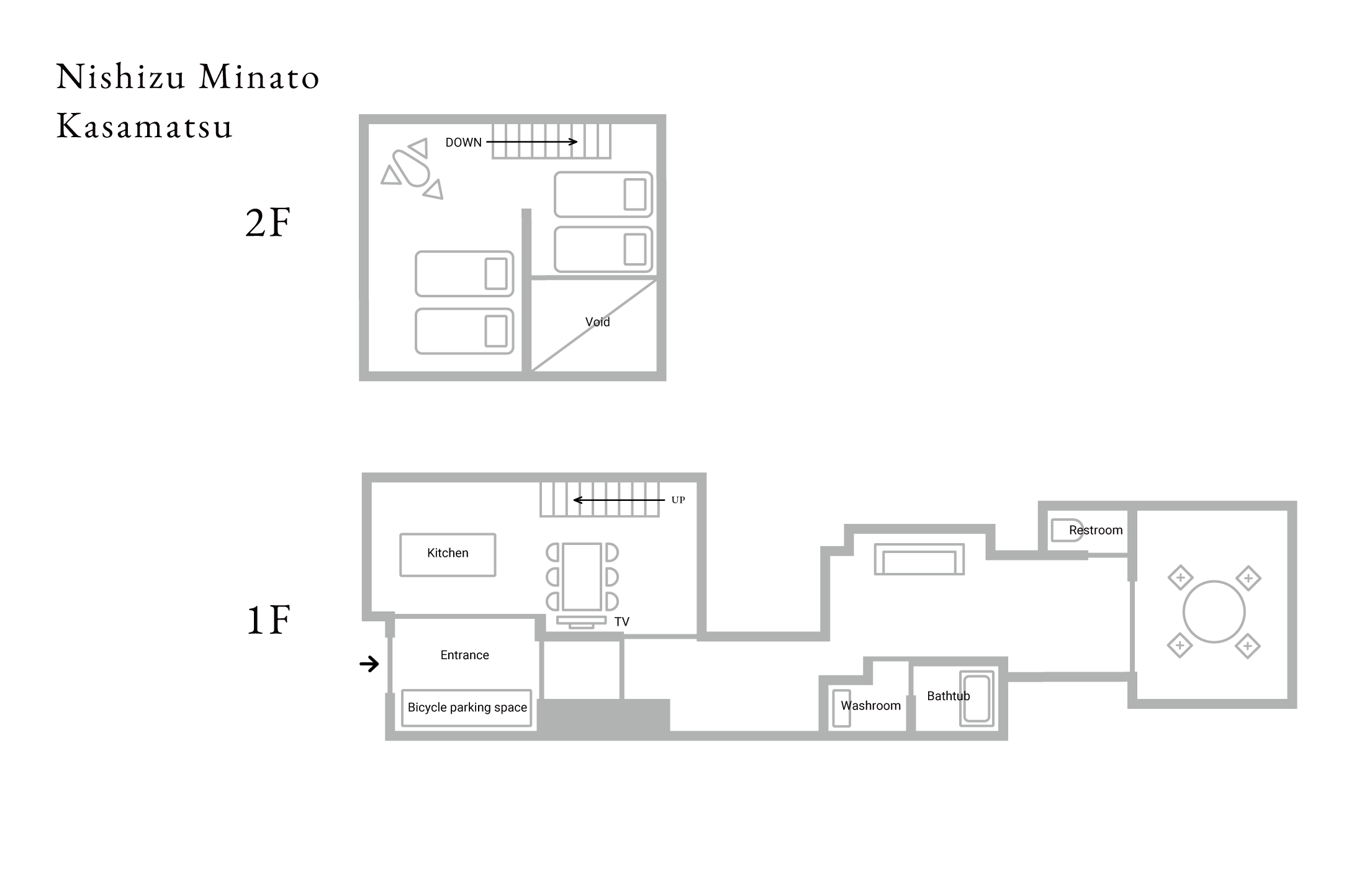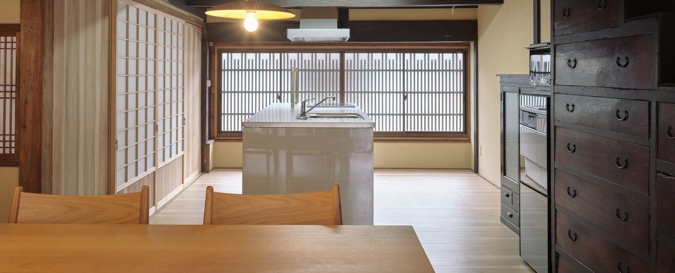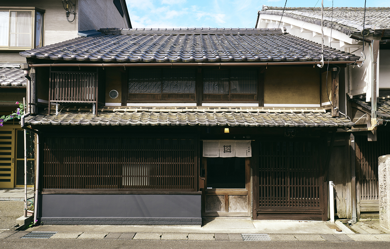 Located in the Nishizu area, which once prospered as a port of call for Kitamae ships, “Kasamatsu” is a former sake brewery that is over 100 years old. The bedrooms on the second floor have a modern atmosphere with magnificent beams adorning the ceiling. The entrance has a large earthen floor and a bicycle stand.