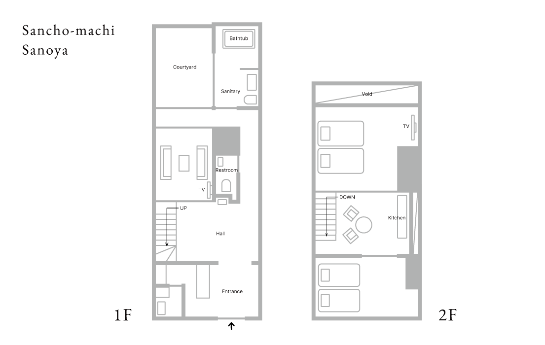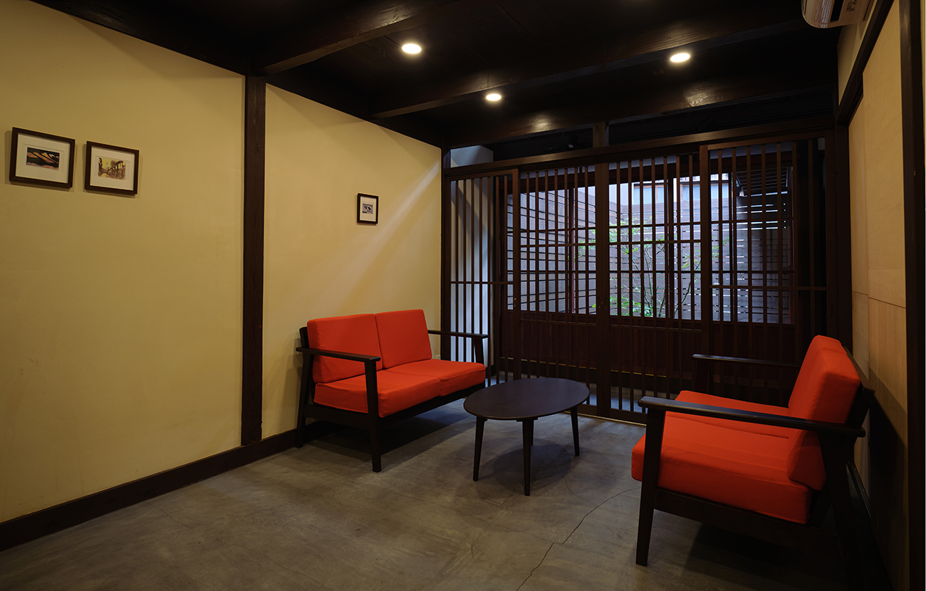 Upon opening the door, you will find "Sanoya" to be a space where tradition and modernity merge. The exterior, which blends in with the surrounding townscape, creates an extraordinary atmosphere. The sophisticated interior of the inn features a relaxing earthen floor living room and comfortable bedding while making use of the machiya layout, and the open-plan bathroom allows guests to relax and unwind from their travels while enjoying the view of the internal garden. The old beauty of the machiya is preserved, while modern lifestyle comforts are incorporated to create a superb machiya stay.