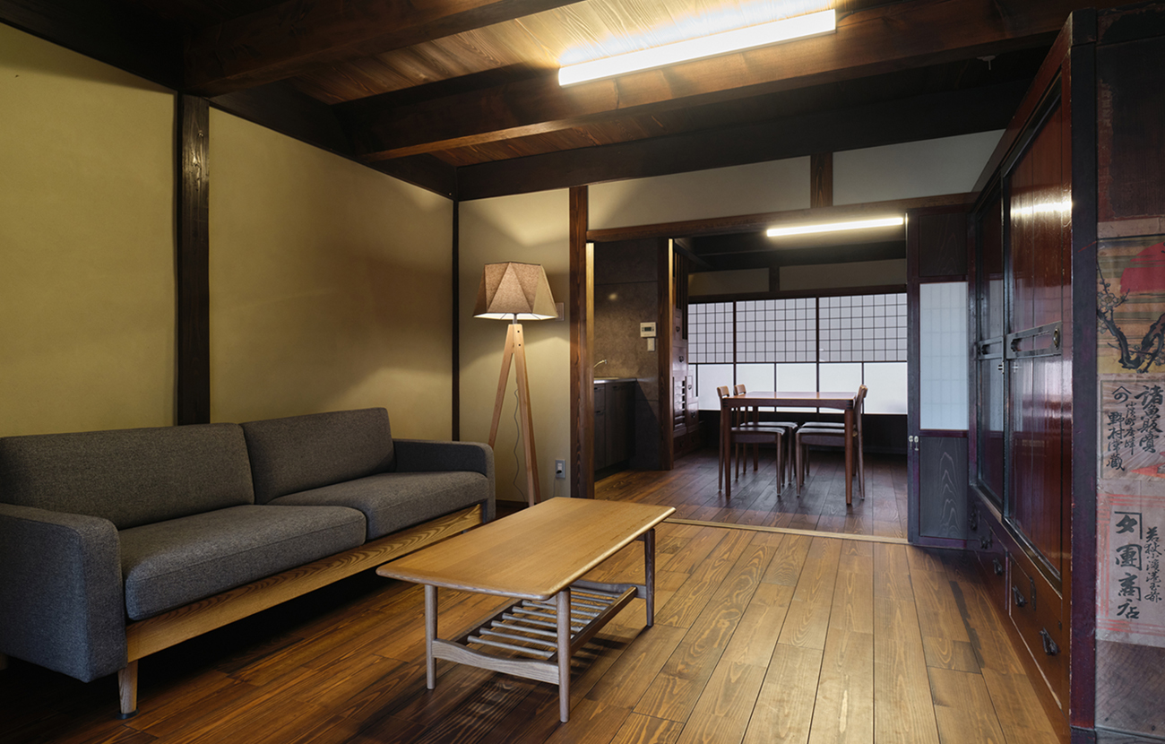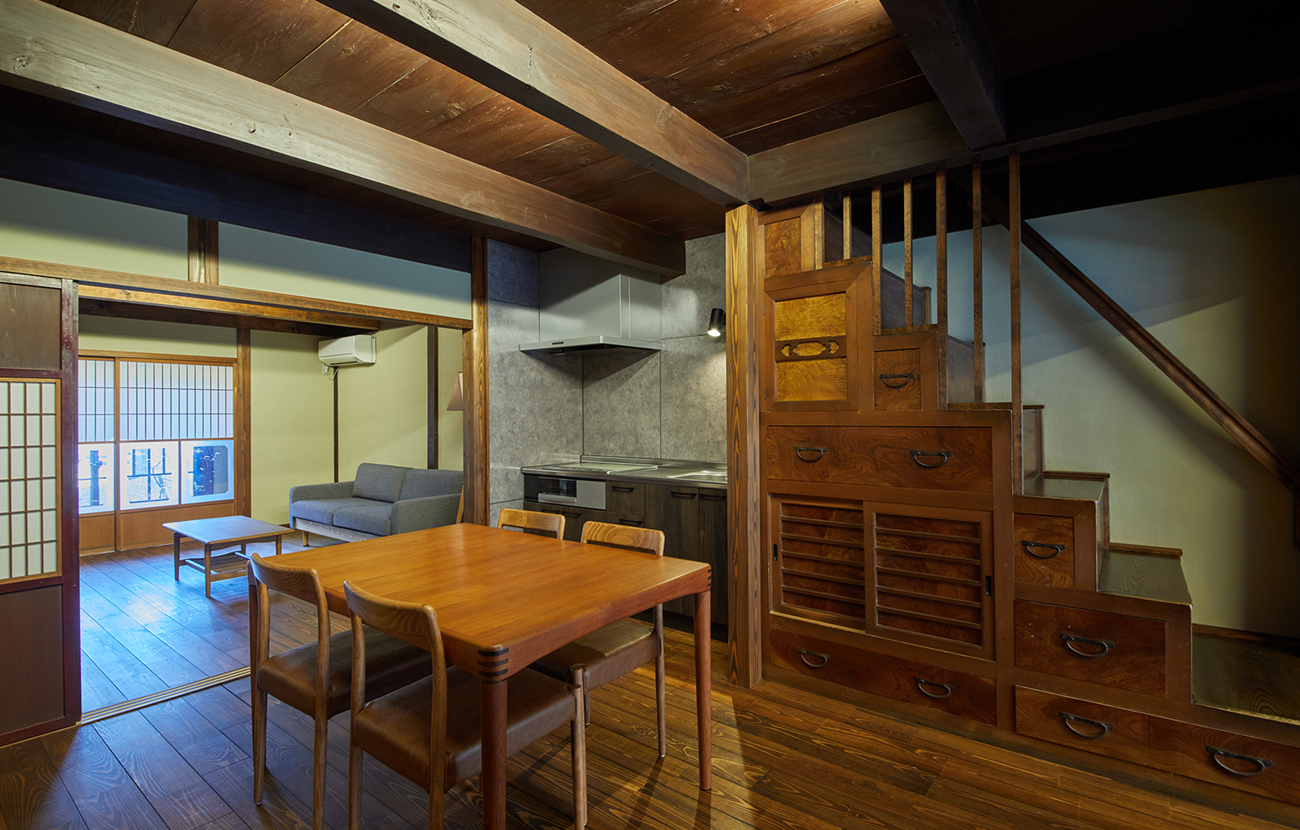 The “Tsuda Main House” was renovated from a Japanese-style confectionery shop built in 1914, which was familiar to the people of Obama, and features two living rooms with a kitchen on the first floor and three Japanese-style bedrooms on the second floor. The serene space is furnished with staircases and furnishings of the time, retaining the appearance of the building's former days as a Japanese sweets shop. There is a spacious living/dining room and a bedroom with tatami mats, making it possible to accommodate a large group of guests.